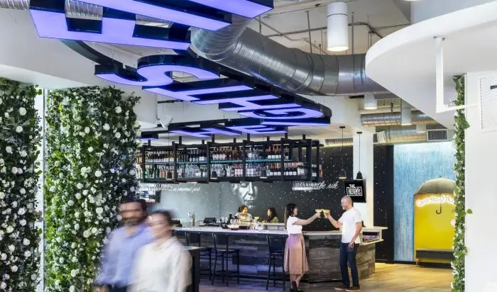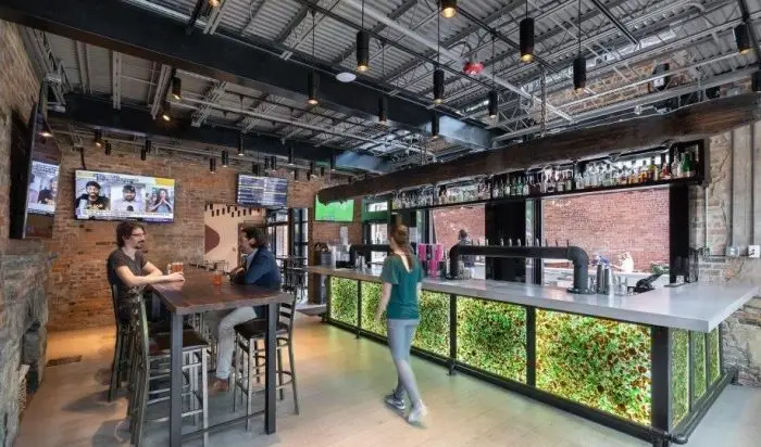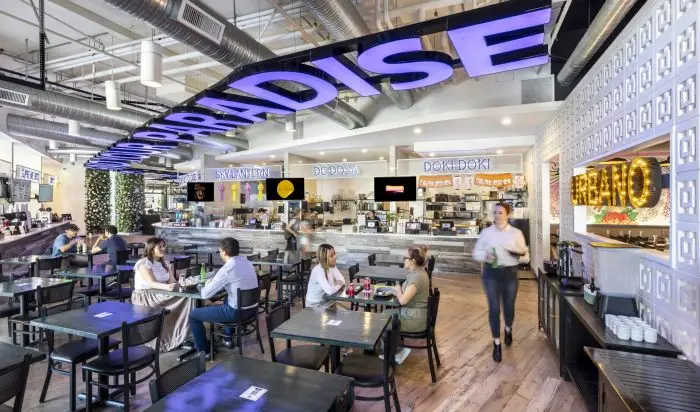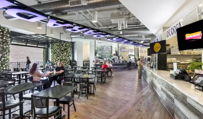 The Heights Food Hall transforms a 13,000 SF space that was abandoned by a retail clothing store during the COVID-19 lockdown into a vibrant culinary destination featuring a dine-in restaurant, central bar, adjacent speakeasy, and eight food stalls that showcase the talents of DMV area chefs.
