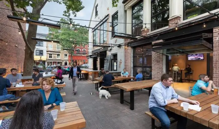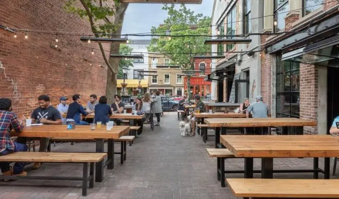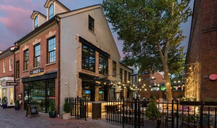 Located on Alexandria’s vibrant King Street, Augie’s Mussel House brings Belgian-inspired fare and a lively beer garden experience to Old Town Alexandria. We transformed a former steakhouse into an indoor-outdoor destination, providing full architectural and interior design services. The project required Historic Board of Architectural Review approval and includes a bar and dining areas, kitchen, restrooms, and exterior patio.